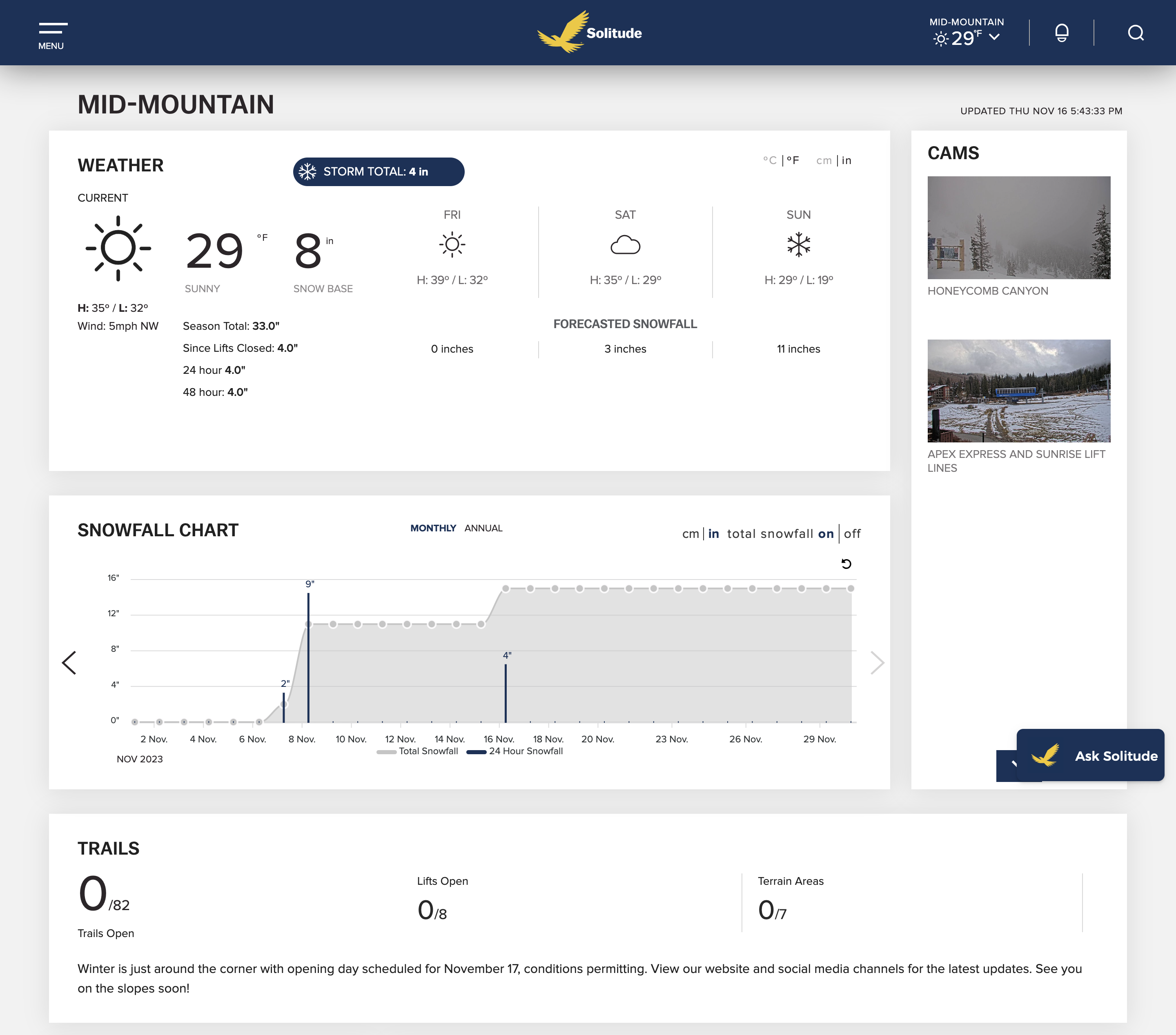 Prior to undertaking this initiative, each resort under the company umbrella built a custom mountain report page and reporting system. This set up required intensive upkeep and created inconsistent guest experiences across 14 sites. My pitch was to create a white-label mountain report template and standardized backend system that would accommodate all key reporting needs while offering flexibility for diverse operations and offerings across resorts and winter/summer seasons. Resort marketing leaders could opt-in to implement the new React-based frontend and streamlined backend system.